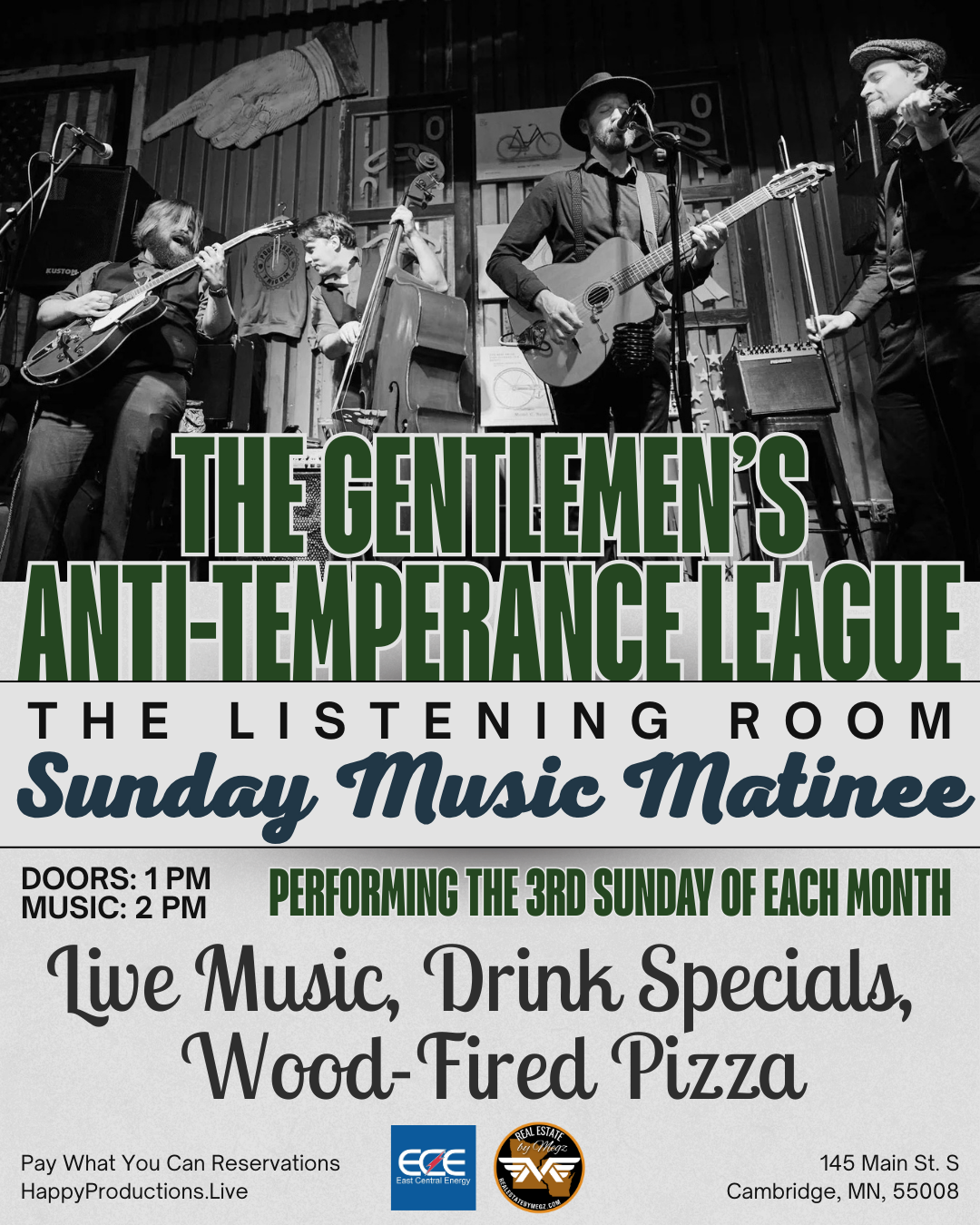 Join us on the 3rd Sunday of each month for The Gentleman’s Anti-Temperance League. Blending vintage hot-club jazz, swing, and modern songwriting, GATL plays jazz originals and modern songs under an old-time façade. With years of touring and multiple albums behind them, they bring a tight, energetic set rooted in hot jazz and sharp musicianship.