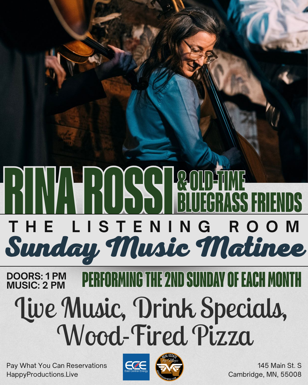 Join us on the 2nd Sunday of each month for Rina Rossi & Old Time Bluegrass Friends! Rina Rossi is a long-time fixture in the Twin Cities old-time and bluegrass scene, playing guitar, bass, singing, square dance calling, and helping organize traditional music events. She’s a key member of the Midwest old-time/bluegrass group Steam Machine, which has toured nationally. She’s known for her deep roots in community music and dance. Each Sunday will showcase Rina alongside a rotating lineup of some of the region's most talented bluegrass musicians and collaborators.